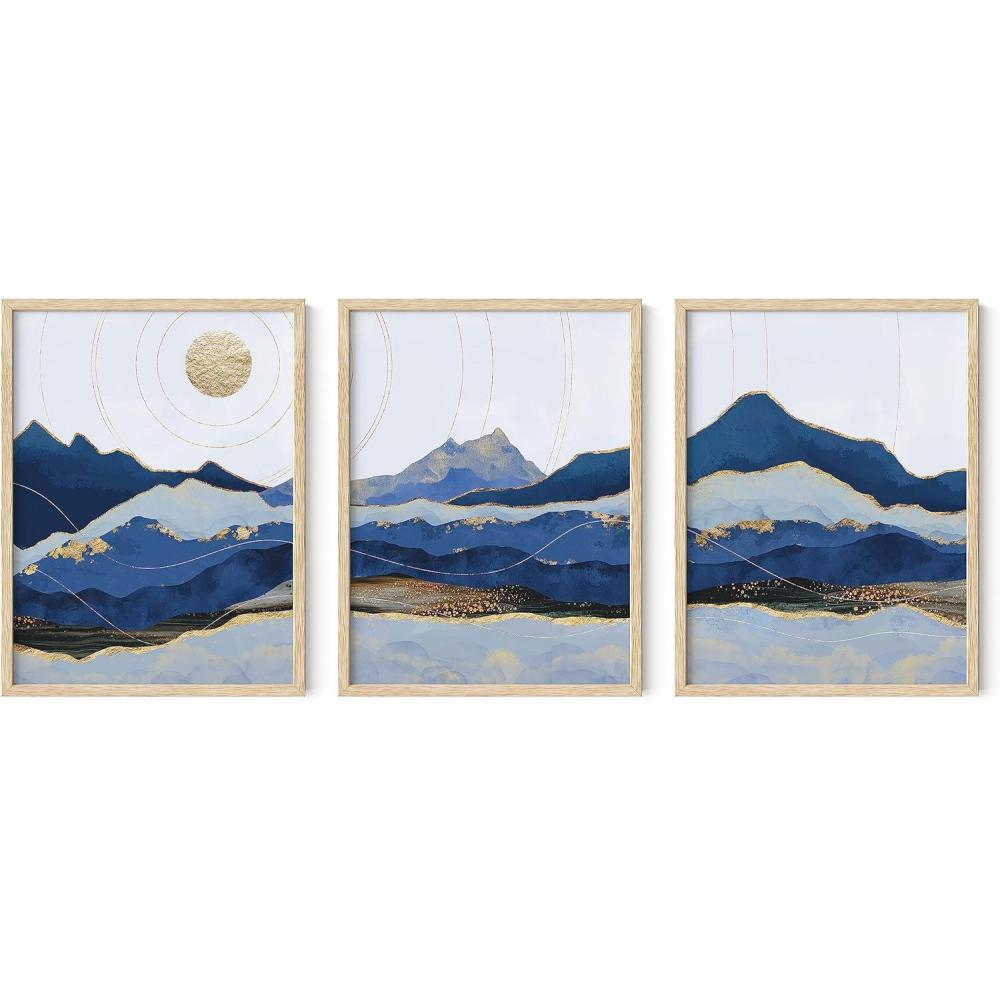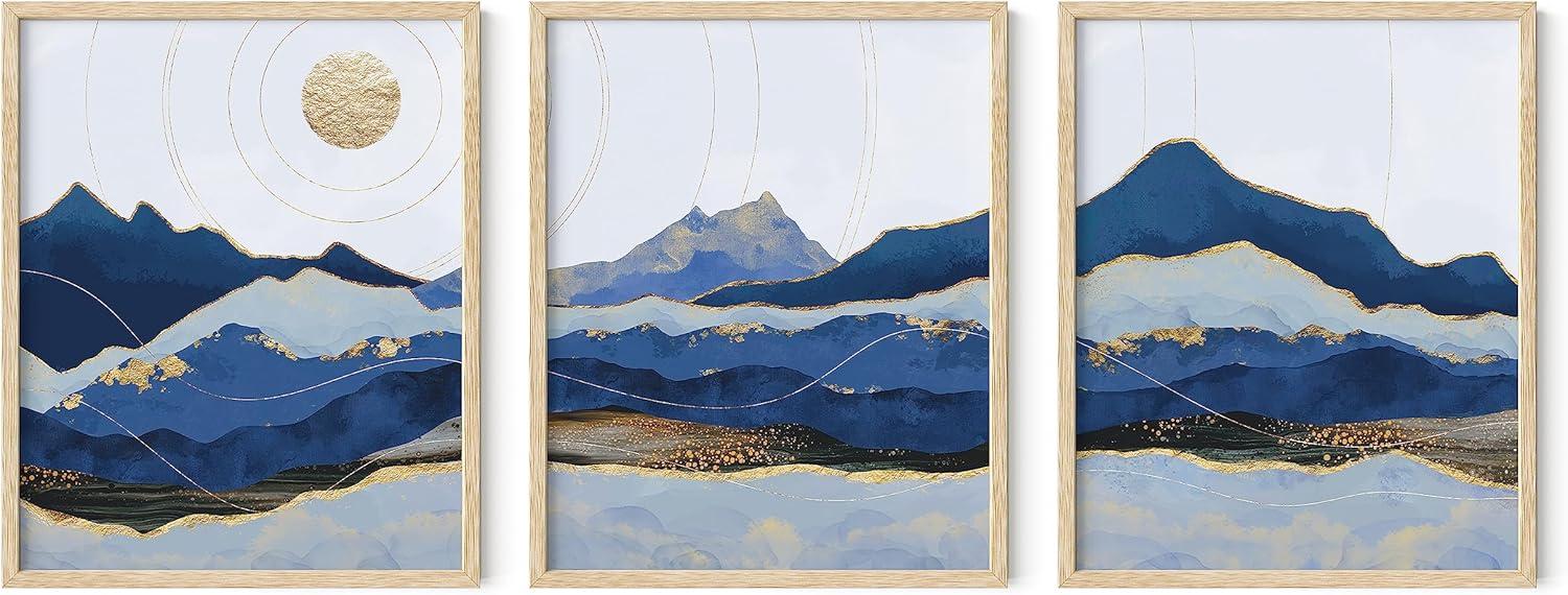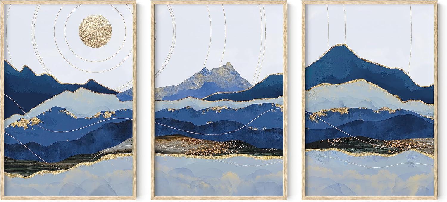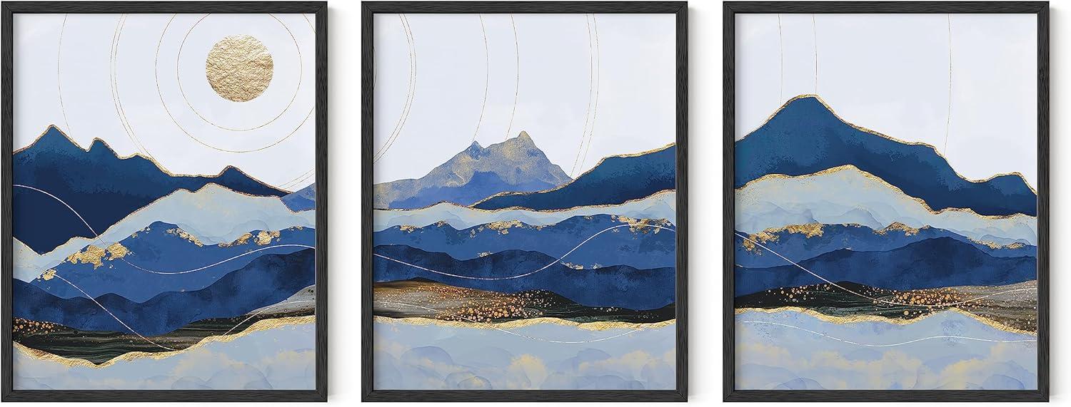 imageHAUS AND HUES Abstract Art Wall Decor  Set of 3 Abstract Wall Art for Living Room Blue Posters Geometric Wall Art Abstract Room Posters Aesthetic Colorful Wall Art Black Frame 24x36Blue Mountain
