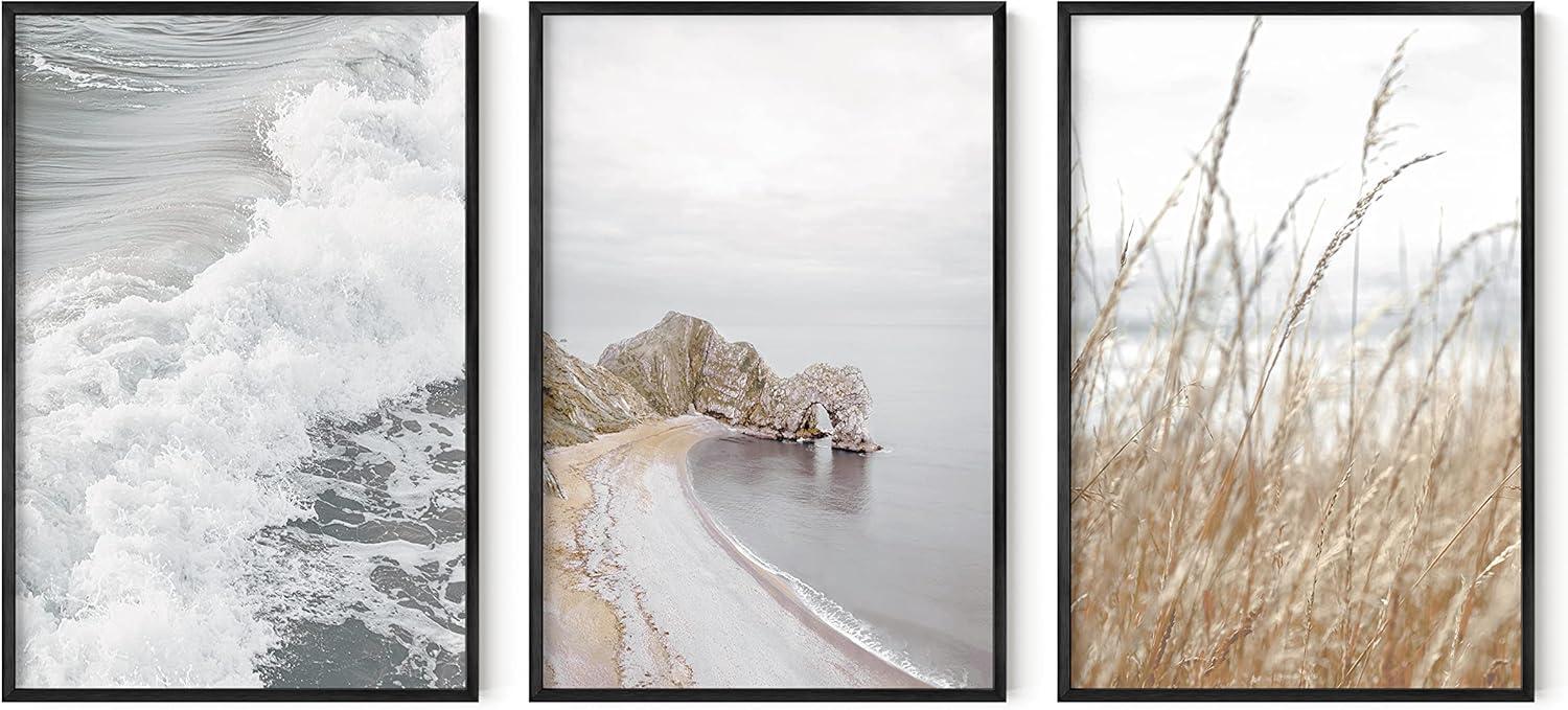 HAUS AND HUES Abstract Art Wall Decor - Set of 3 Abstract Wall Art for Living Room, Blue Posters Geometric Wall Art Abstract, Room Posters Aesthetic Colorful Wall Art (Black Frame, 24x36)(Shore Waves)
