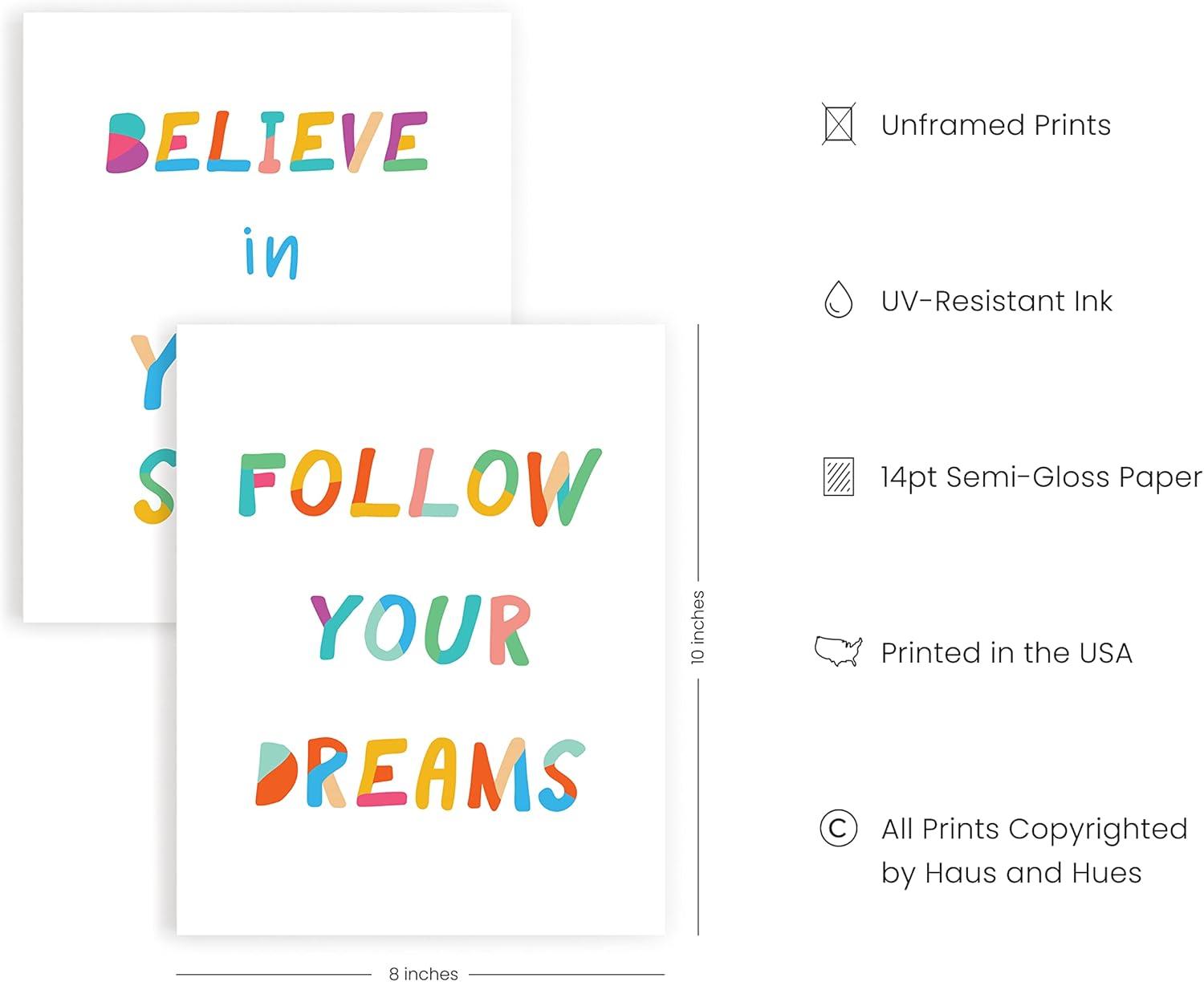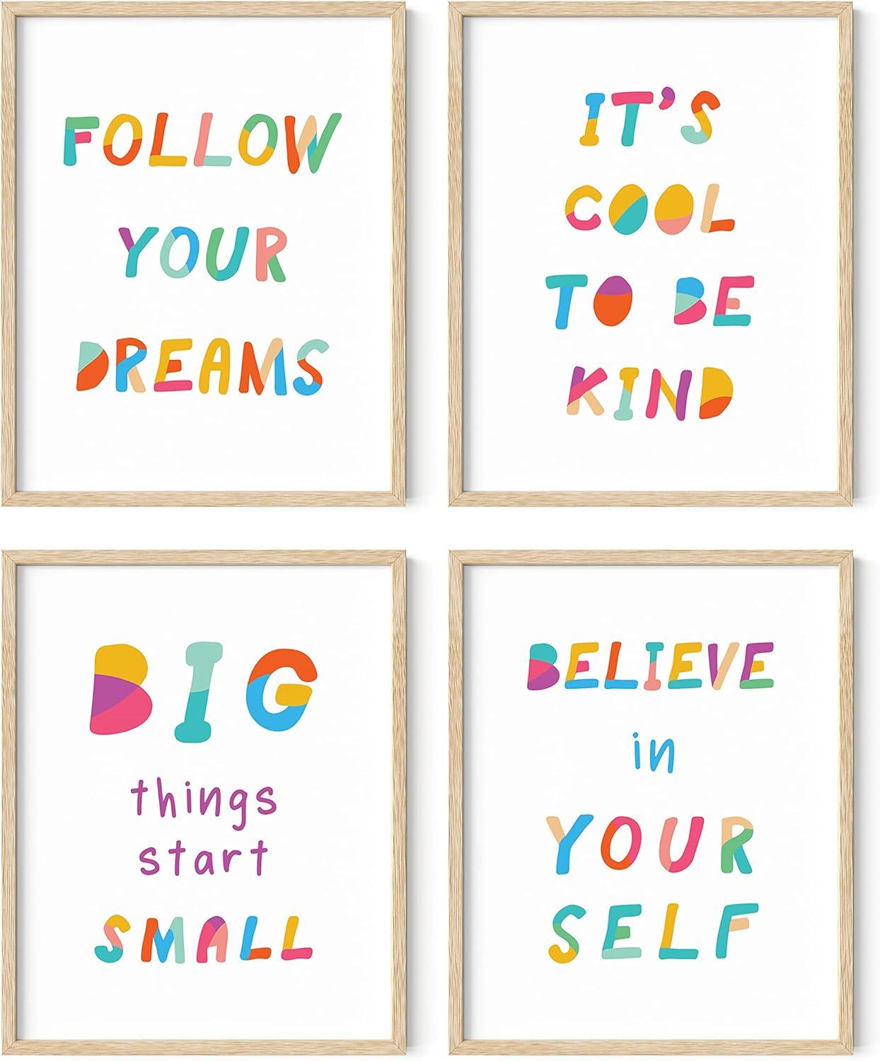 ENCOURAGING WALL ART: Our prints are meant to motivate young kids to believe, be kind, follow their hearts and pursue their dreams. Presented in big, bold colorful texts, this set of kids decor adds a positive vibe to a space where you can foster children’s creativity and stimulate their imagination. Hang these inspirational posters as a set or separately throughout the home to fill kids with a sense of wonder in a world bursting with opportunities